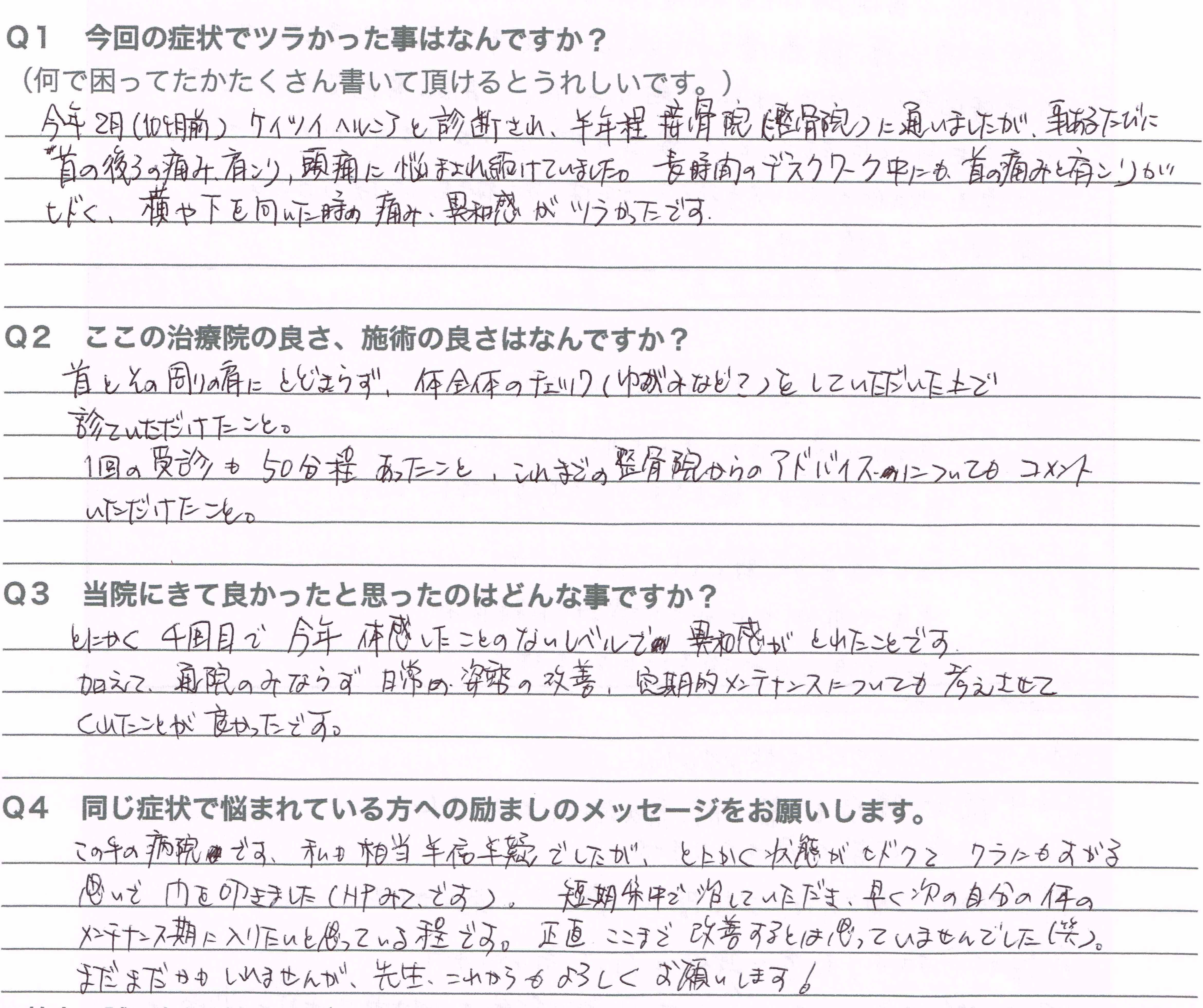 今年2月に(10ヶ月前)頚椎ヘルニアを診断され半年ほど接骨院に通いましたが、ことあるたびに首の後ろの痛み、肩こり、頭痛に悩まされ続けていました。